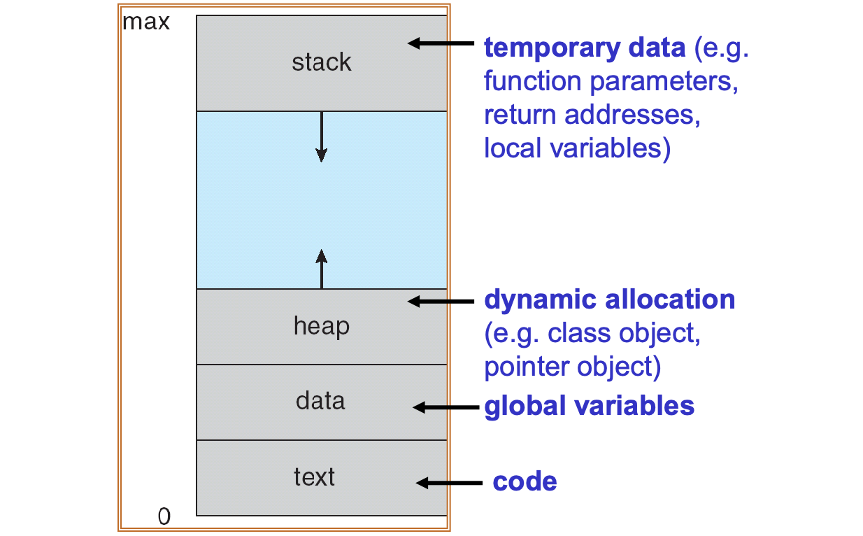 - stack: temporary data (function parameters, return addresses, local variables)